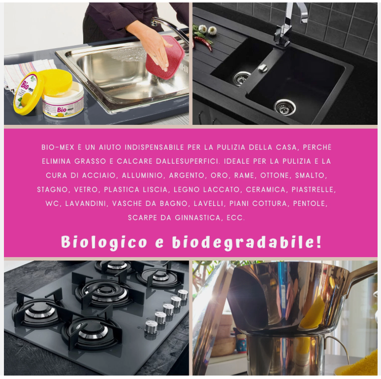 - Versatile: Bio-mex è ideale per la pulizia di una vasta gamma di superfici, tra cui acciaio, alluminio, argento, oro, rame, ottone, smalto, stagno, vetro, plastica liscia, ceramica.